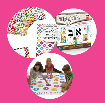 Colorful Hebrew worksheet featuring a bird, cat, dog, and owl, with mazes and Hebrew letters for children to trace