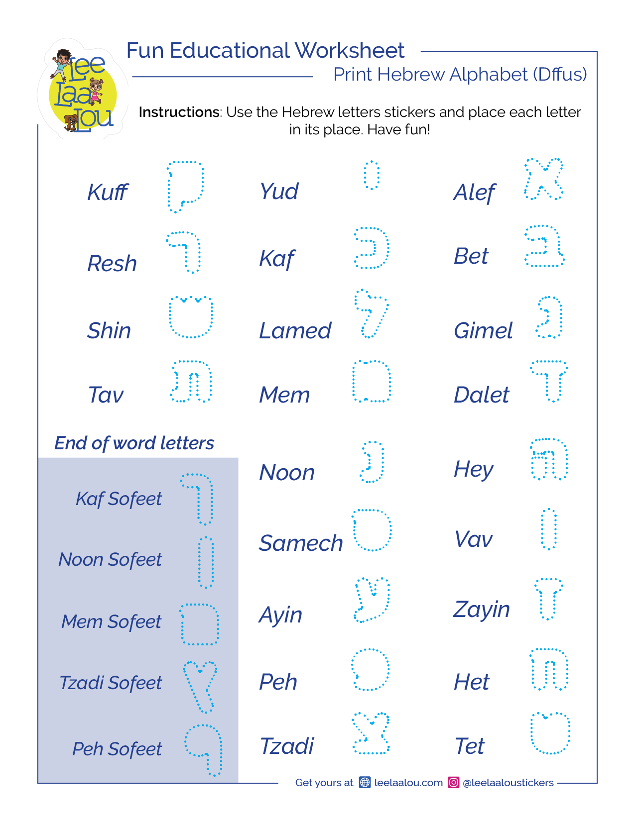 Use our Hebrew letters and place each letter in its correct place. A great way to learn the names and forms of the print Hebrew alphabet.