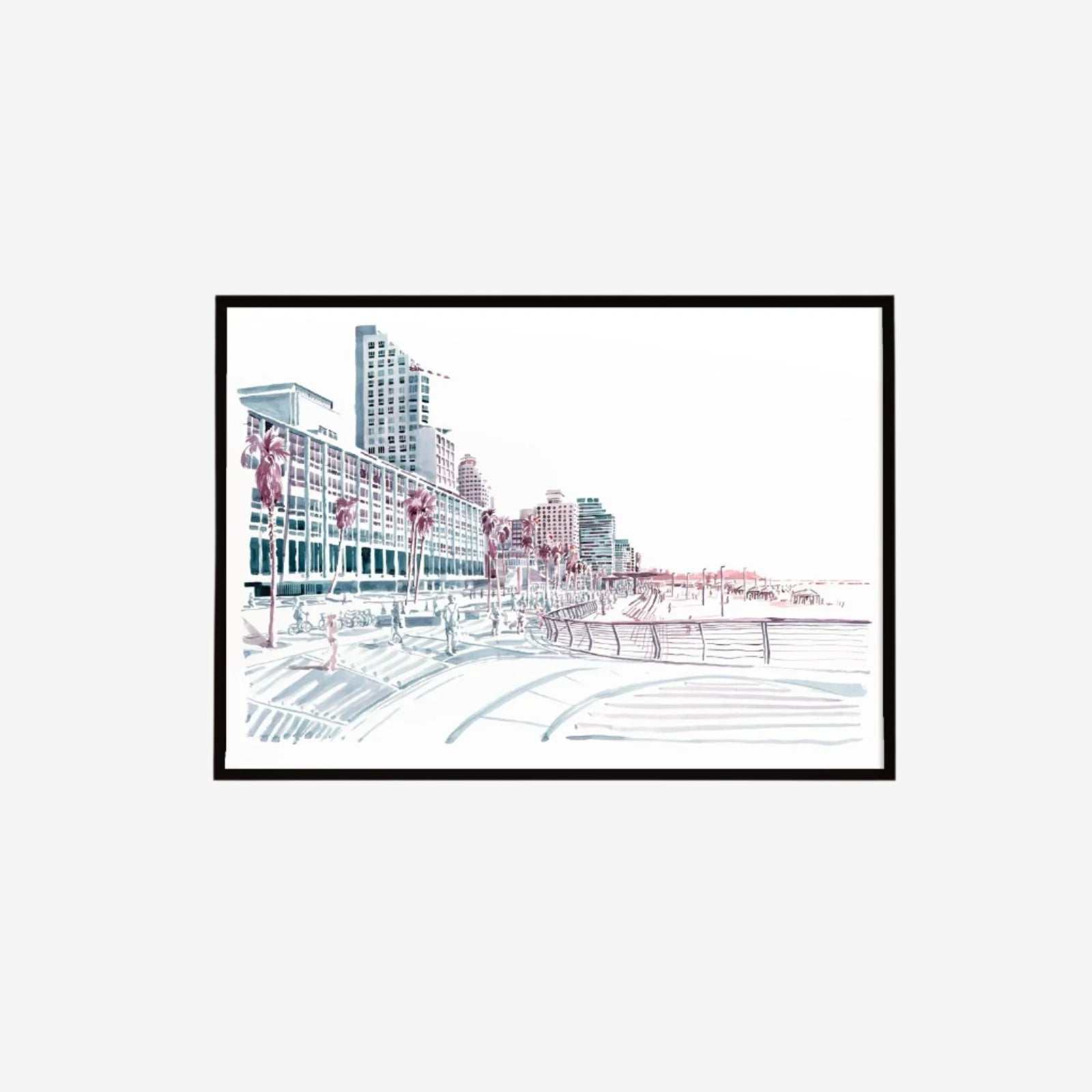Capture the vibrant spirit of Tel Aviv with this stunning print showcasing the iconic boardwalk along the beach. The image captures the perfect blend of city life and coastal tranquility, with the blue skies and gentle waves contrasting beautifully against the bustling promenade. This print transports you to one of Tel Aviv’s most beloved locations, where the energy of the city meets the calming allure of the sea, making it a perfect piece to bring a touch of Tel Aviv’s coastal charm to your home.