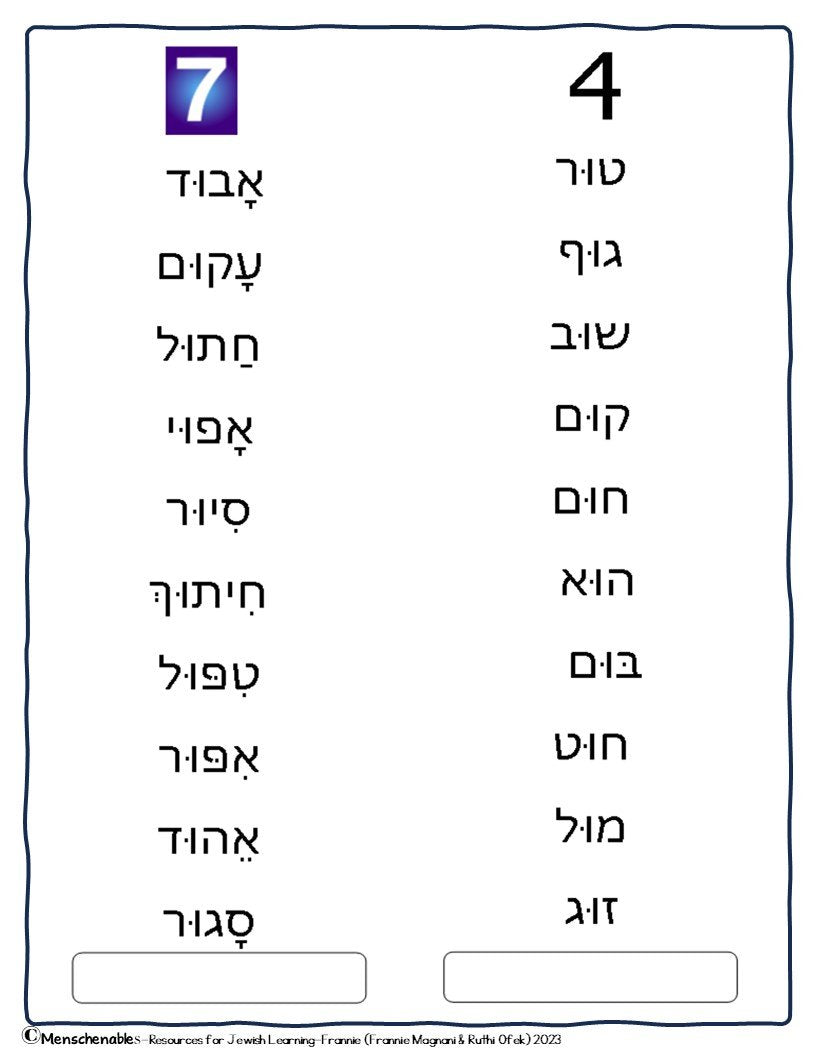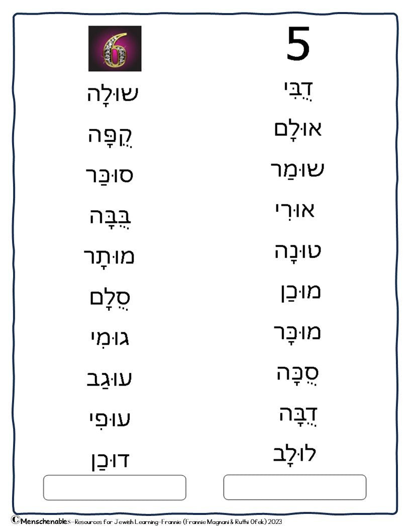 Booklet 3: two-letter words with קמץ, פתח, or חתף פתח and any letter at the end. While the focus is on reading and not on vocabulary, all of the ‘words’ in the practice sets are actual words, which is excellent for native Hebrew-speaking students. It is also an opportunity for the teacher to differentiate and teach vocabulary to some students.
