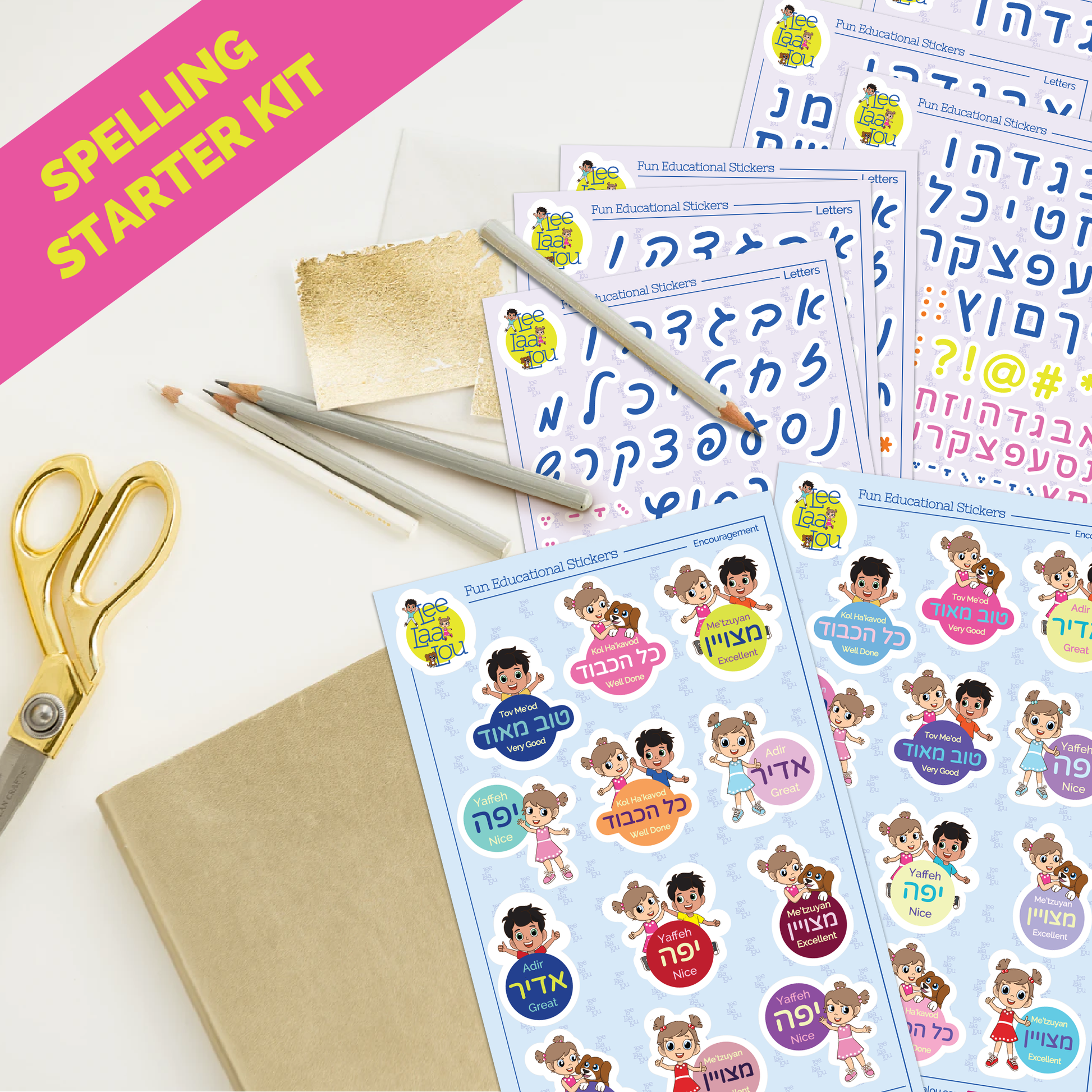 Our Hebrew Spelling Kit includes 3 beautifully designed sticker sets: