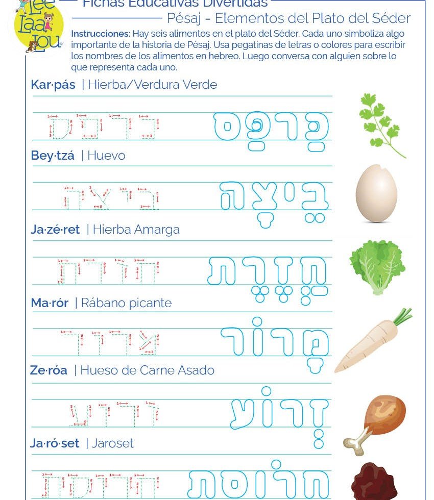 ¡Ahora en español! Aprende sobre los elementos del plato del Séder con esta divertida ficha educativa. Los niños podrán conocer los seis alimentos simbólicos de Pésaj, practicar su escritura en hebreo y explorar su significado. Ideal para enseñar de manera interactiva y cultural a los niños de habla hispana.