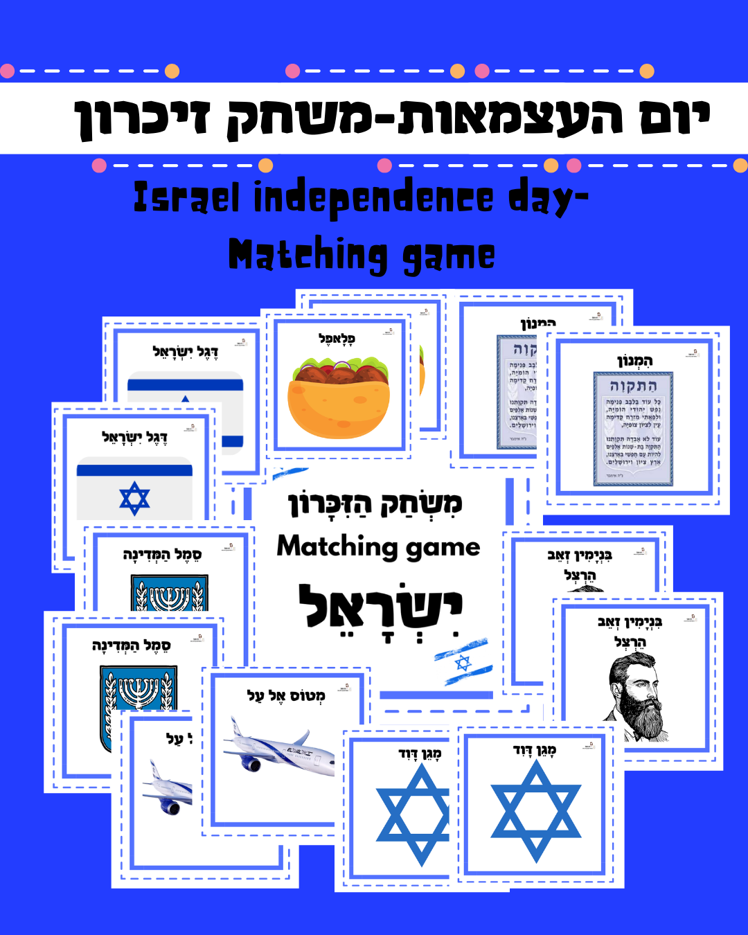 This set includes colorful matching cards featuring iconic symbols of Israel and Yom Ha’atzmaut (Israel’s Independence Day), such as the Israeli flag, Star of David, soldiers, falafel, fireworks, and more!